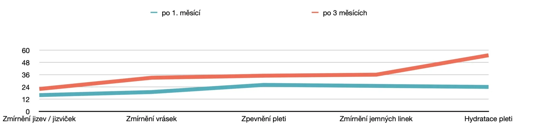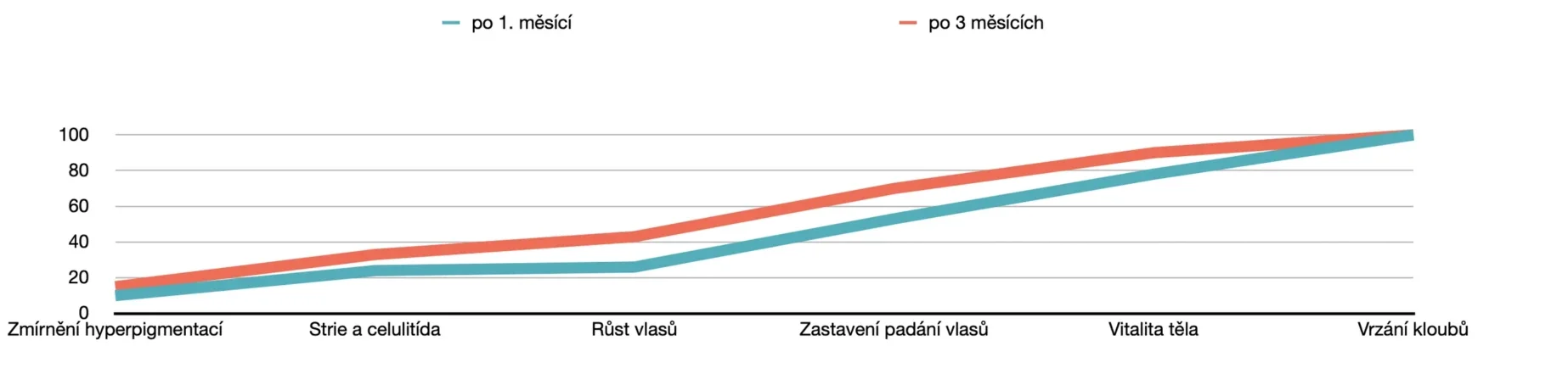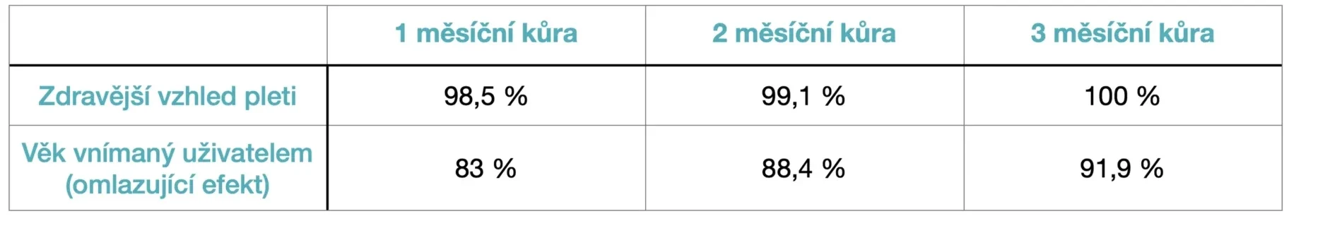 Procento pacientů se zlepšením závažnosti vrásek, dehydrataci pleti, výskytu jemných linek, šupinek pleti a celulitidy. Zlepšení jizev a zlepšení celkové vitality pohybového aparátu, vrzání kloubu. Po užívání 1 sáčku denně, po dobu min. 14 dnů až 3 měsíce.